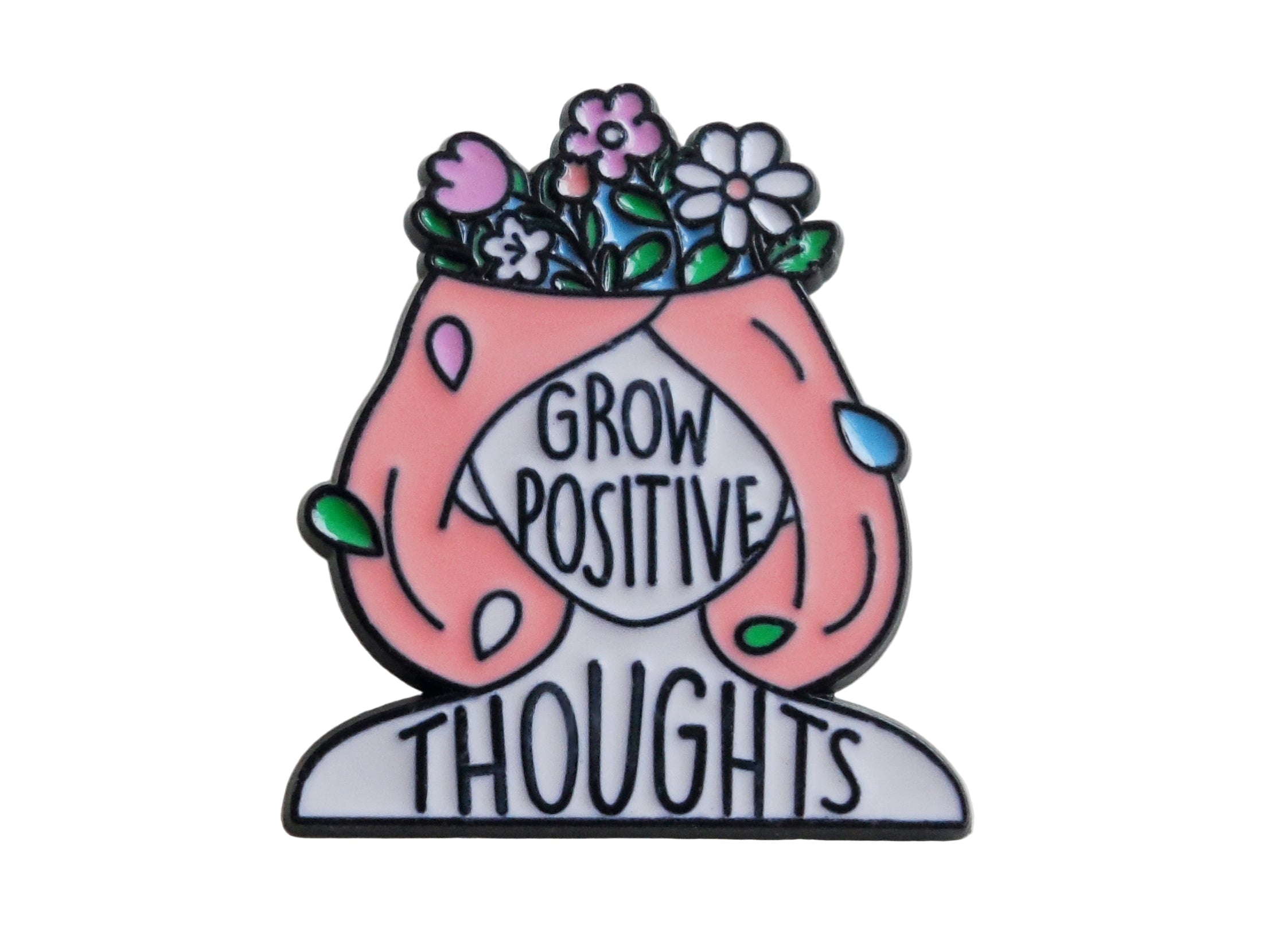 This is for a pin with a girl and flowers and the text "Grow Positive Thoughts". A pin for encouragement. The pin is about 1 inch across.