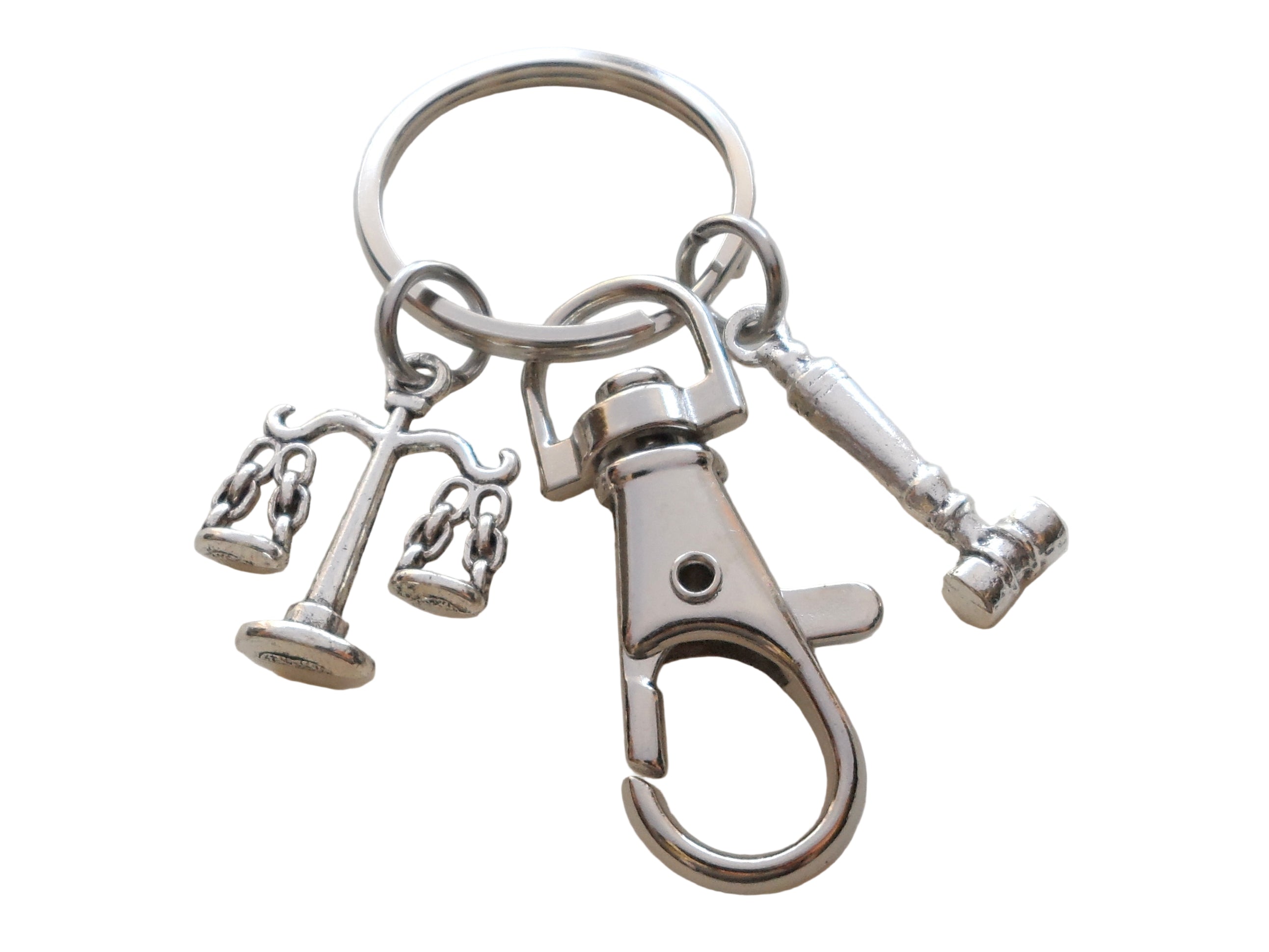 - A keychain with a law scales charm, a gavel charm, and a swivel clasp.