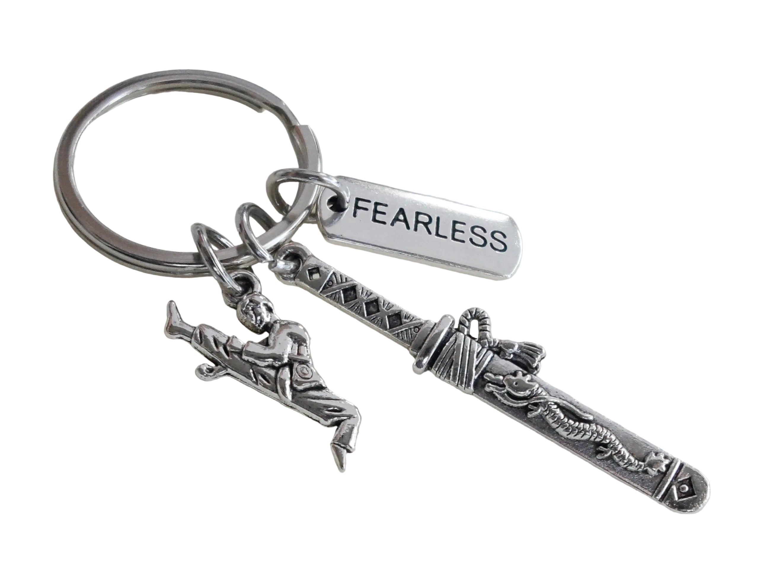 Martial Arts Keychain with Samurai Sword Charm, Fearless Charm, and Kicking Student Charm, Karate, Taekwondo or Coach Keychain
