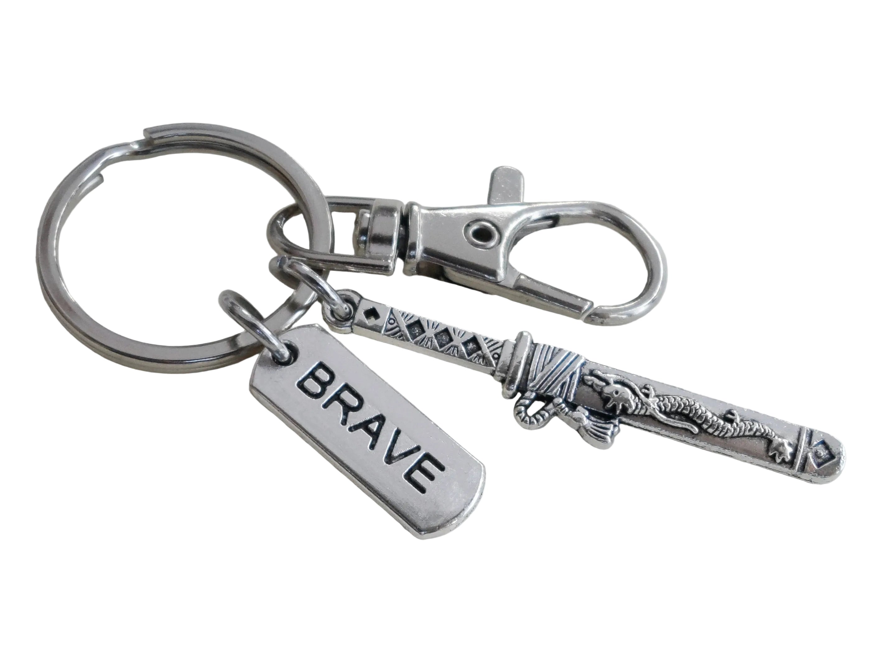 - One keychain with a Samurai sword charm, Brave tag charm, and a swivel clasp.