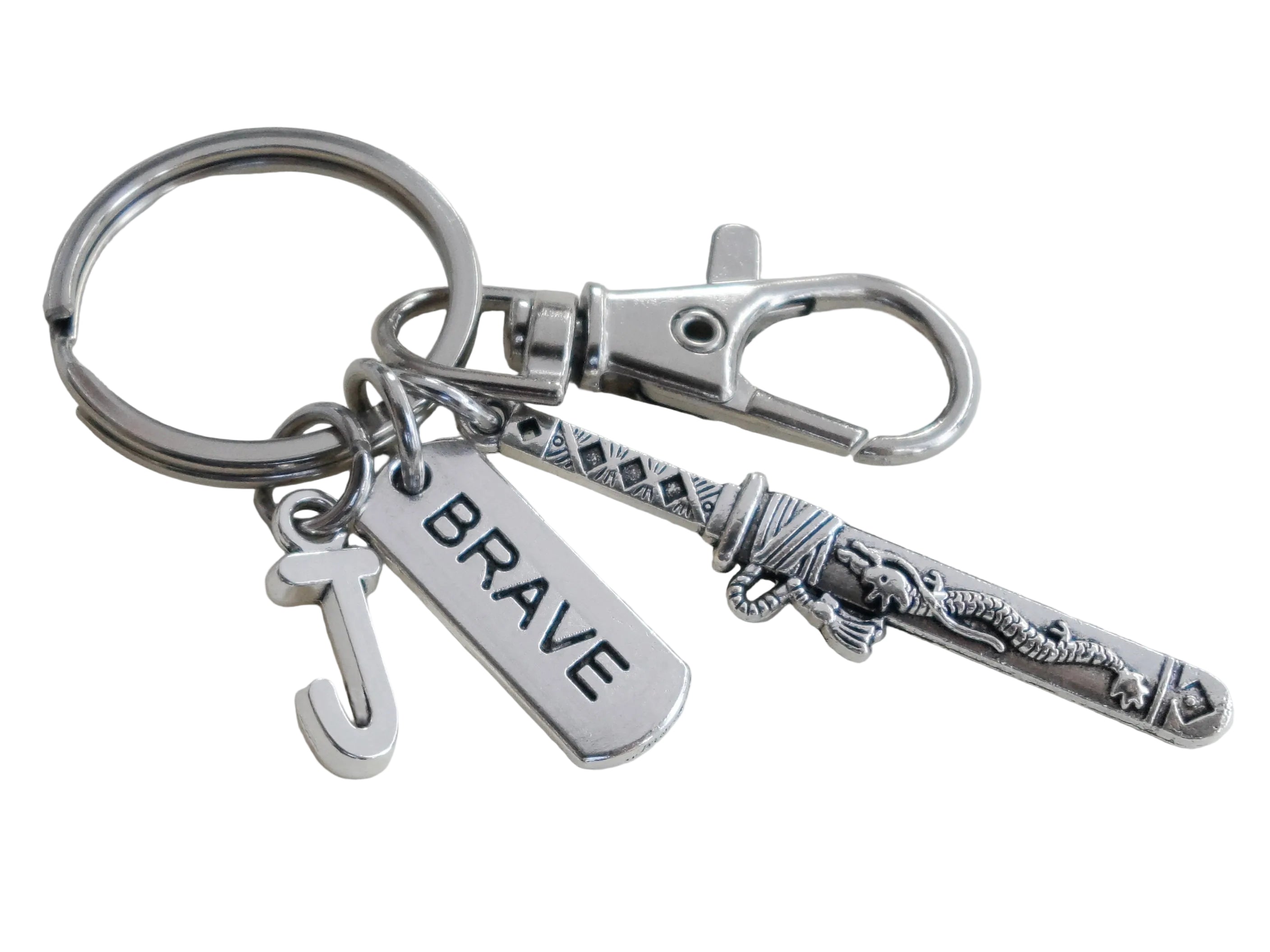 - One keychain with a Samurai sword charm, Brave tag charm, a swivel clasp, and the option to add an initial charm and/or birthstone charm.