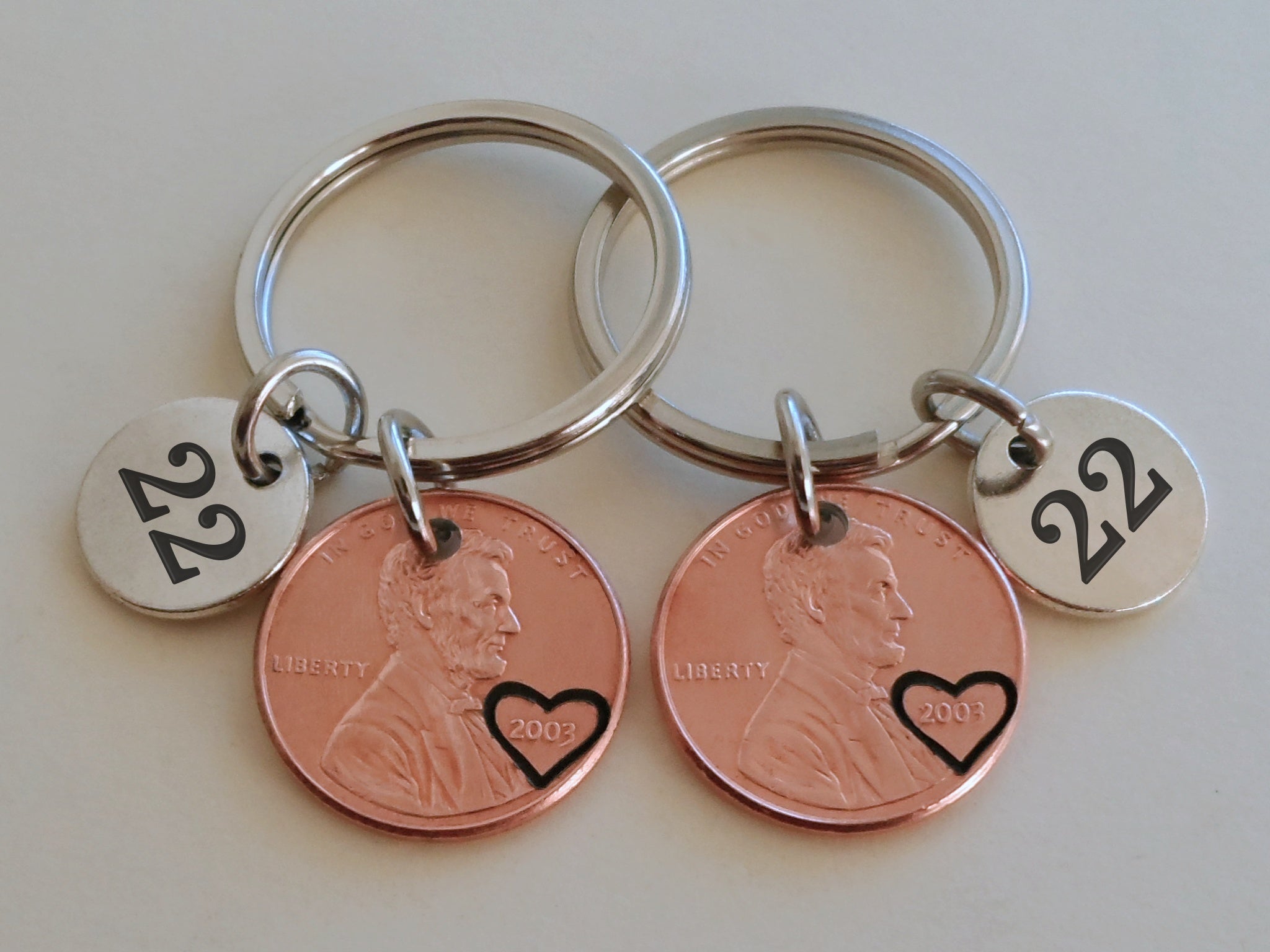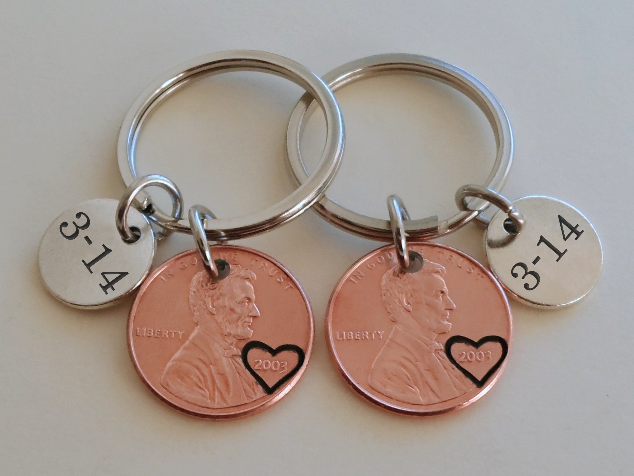 - A set of two penny (one cent) keychains with a heart engraved around the year of the penny, and a custom engraved circle charm.
