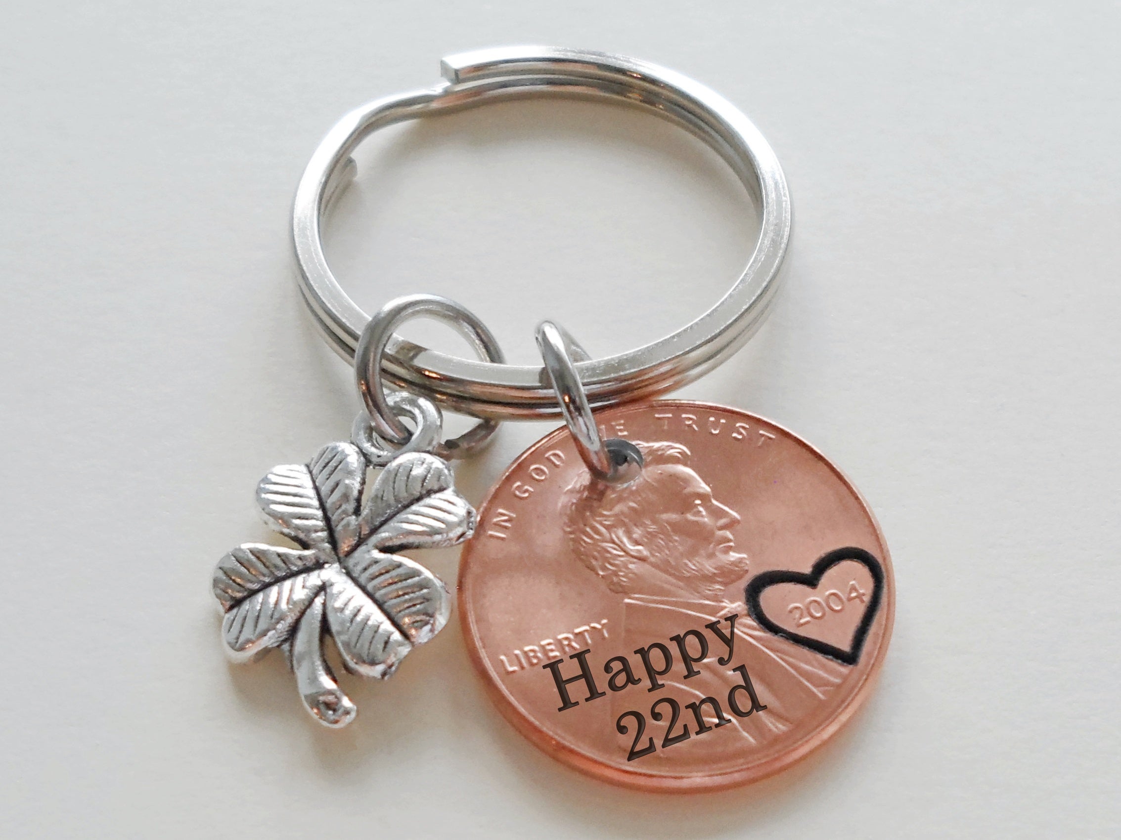 2004 US One Cent Penny Keychain with Engraved "Happy 22nd" and Heart Around Year with Clover Charm; 22 Year Anniversary Couples Keychain