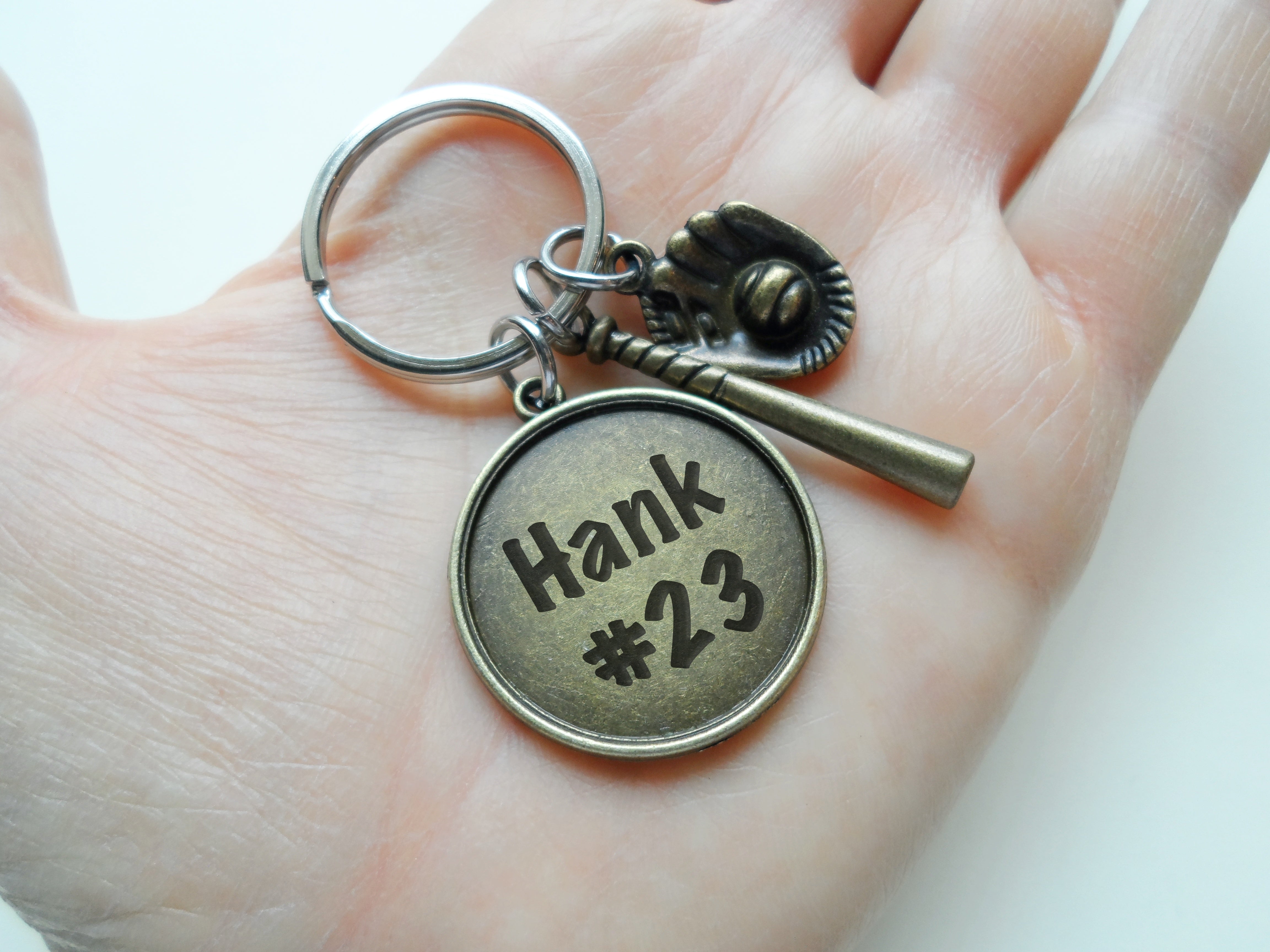 - A keychain with a baseball glove, baseball bat charm, and a custom engraved disc.