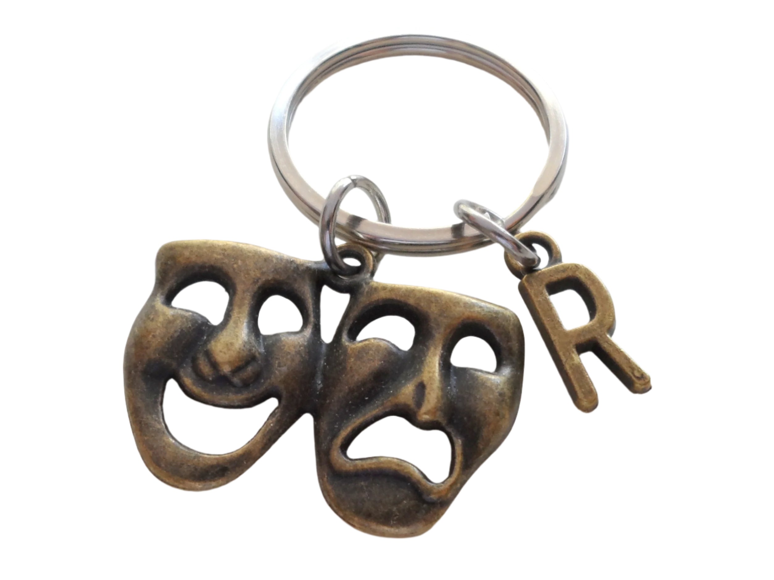 Bronze Theatre Masks Charm Keychain with Custom Letter Charm, Drama Mask Keychain, Graduation Keychain, Actors Keychain