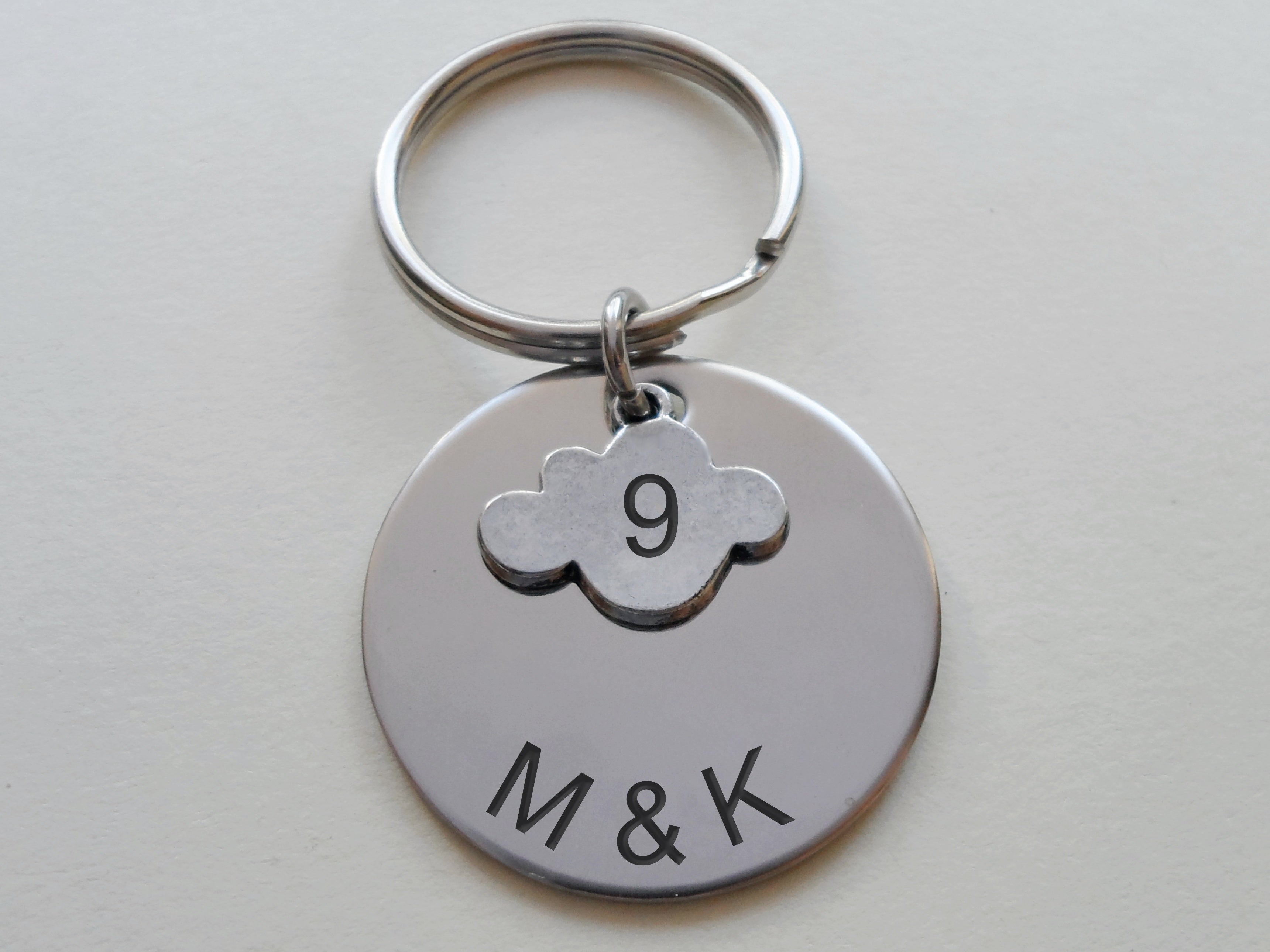 - This keychain has a cloud charm with "9" engraved, and a custom engraved disc.