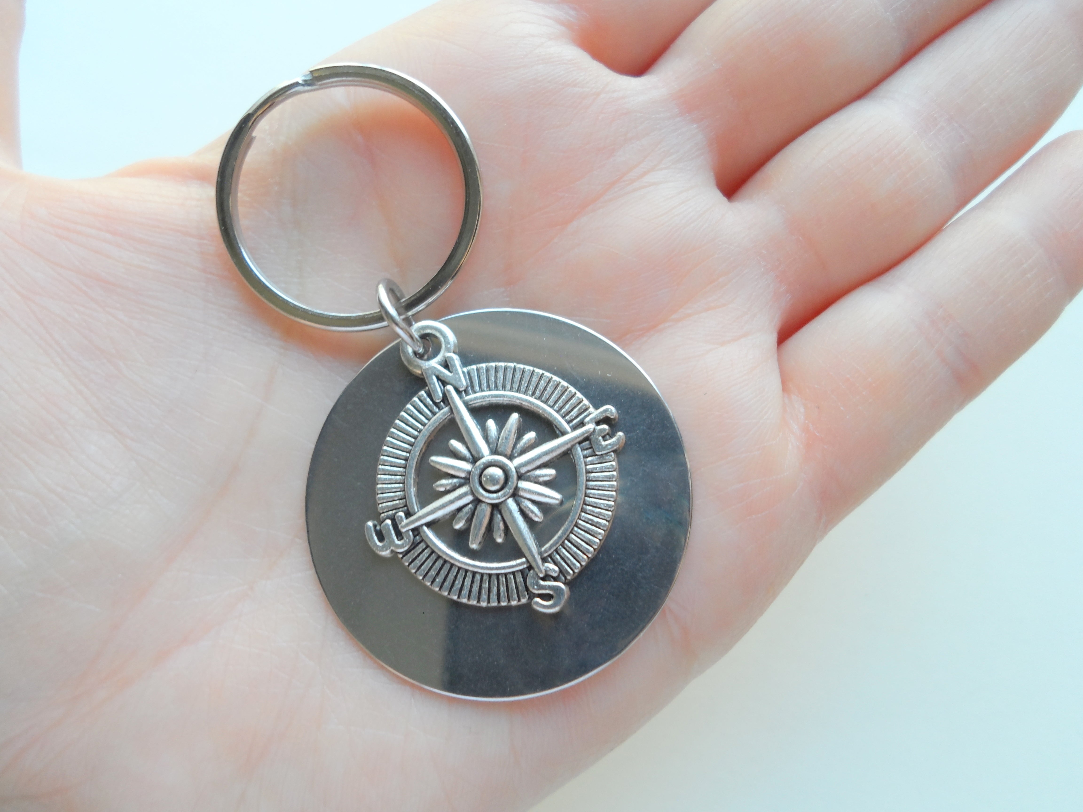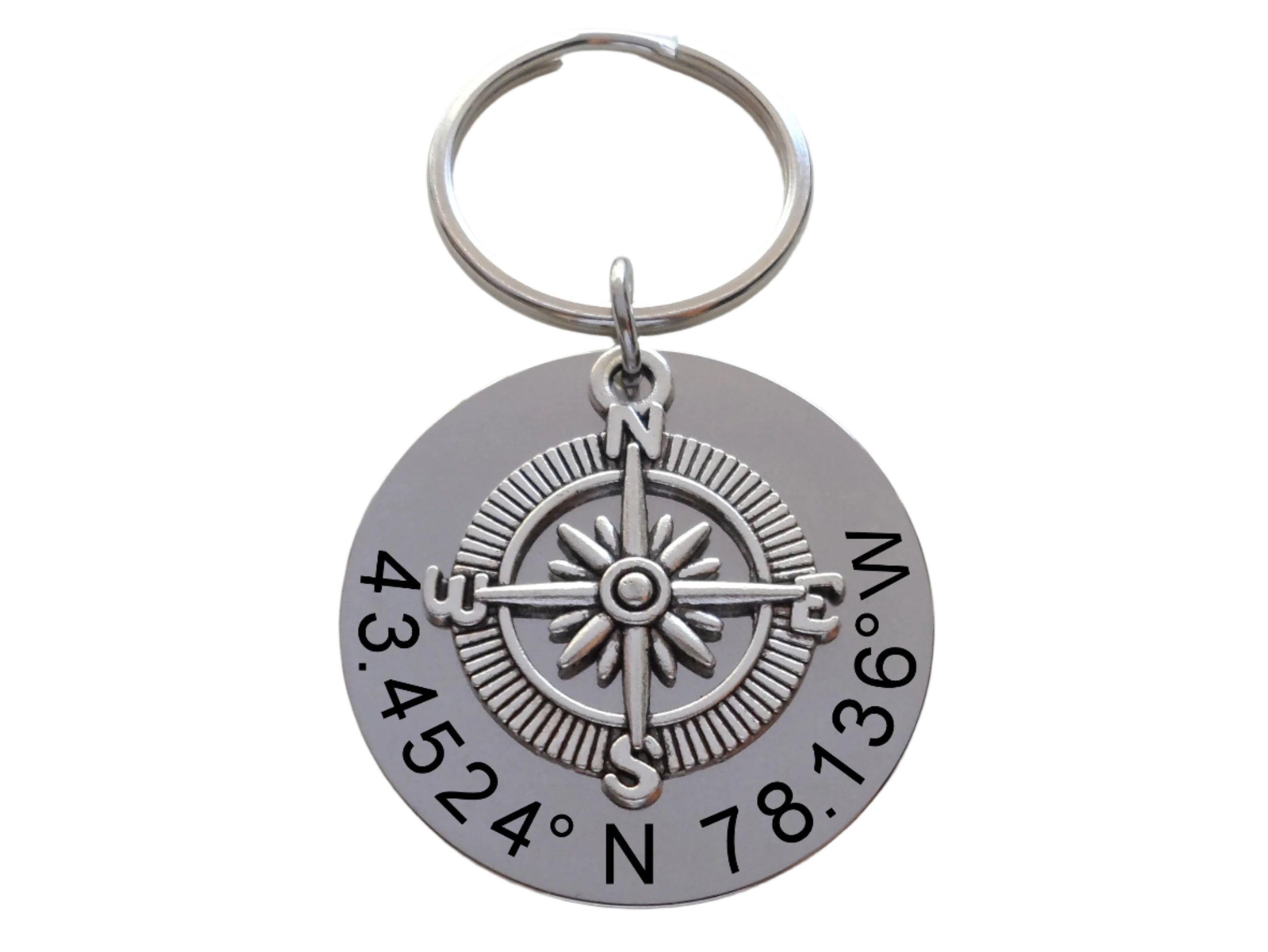 - This is for 1 custom engraved keychain disc with a compass charm layered over. Customize this tag how you'd like with the coordinates to a special location. The backside of the tag can also be engraved.