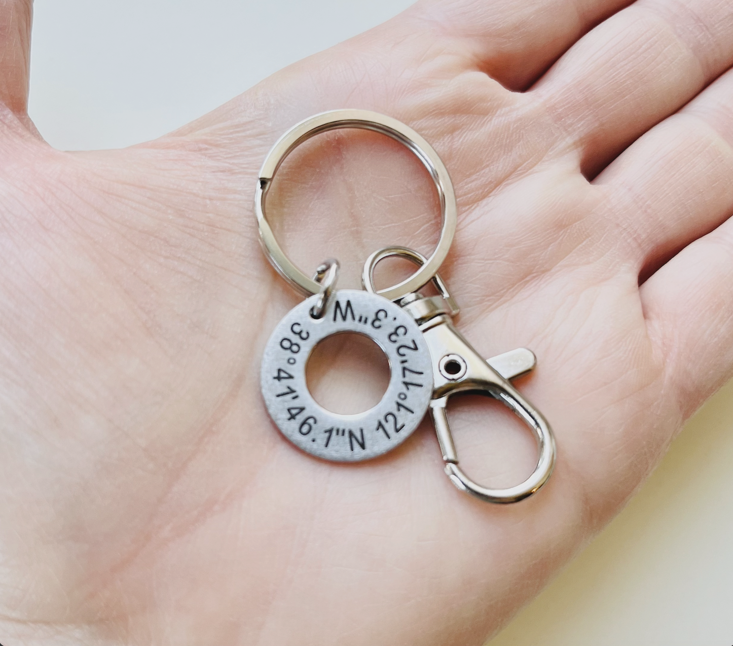 - This is for a custom engraved keychain washer ring with swivel clasp. Customize this washer how you'd like with the coordinates to a special location or text. The backside of the washer can also be engraved.