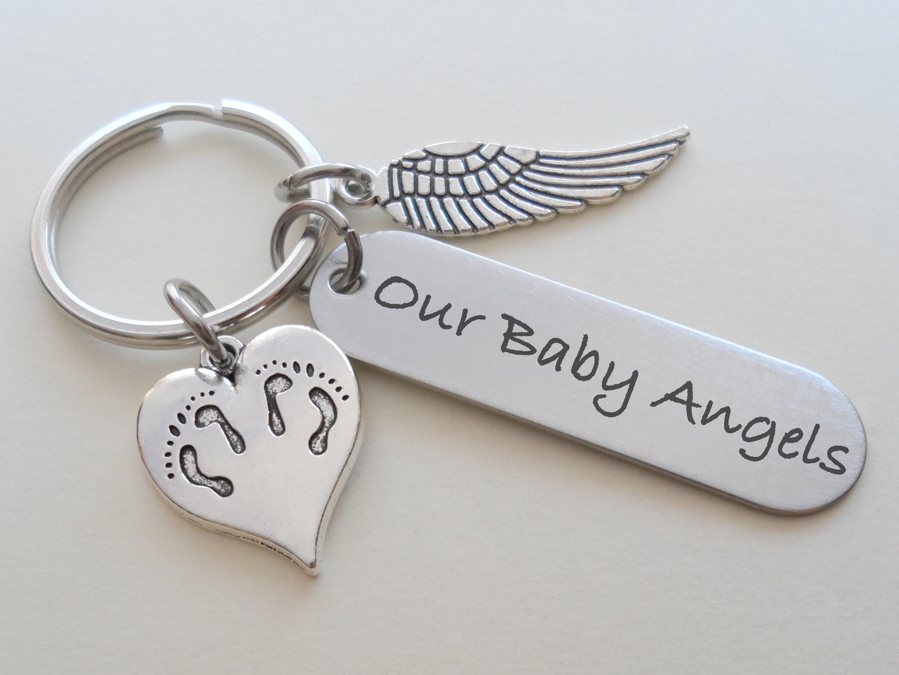 Custom Engraved Memorial Keychain with Twins Feet Heart Charm & Wing Charm, Twin Babies Memorial Keychain