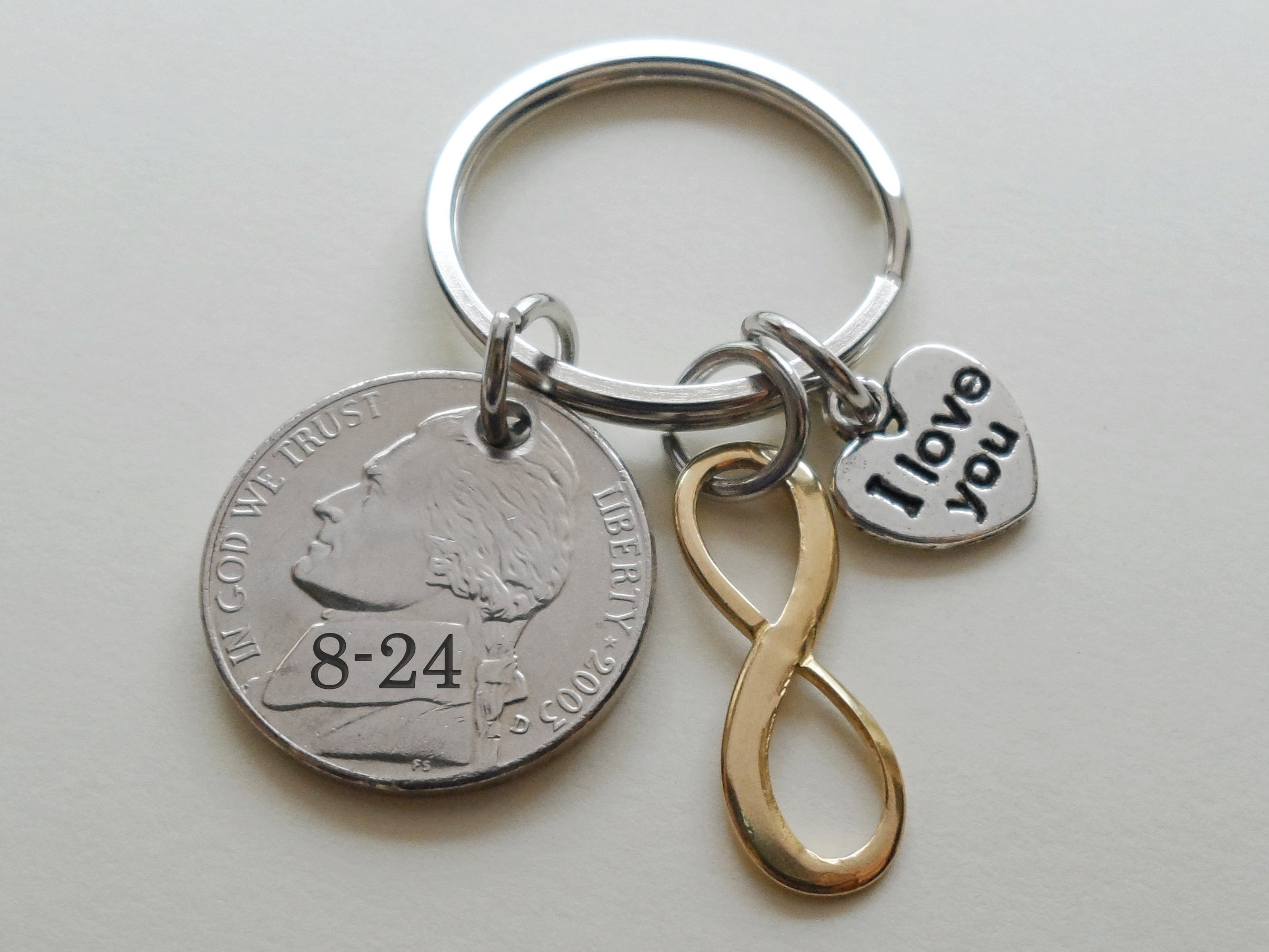 • This is for a keychain with a custom engraved nickel, a brass infinity charm, and an I love you heart charm.