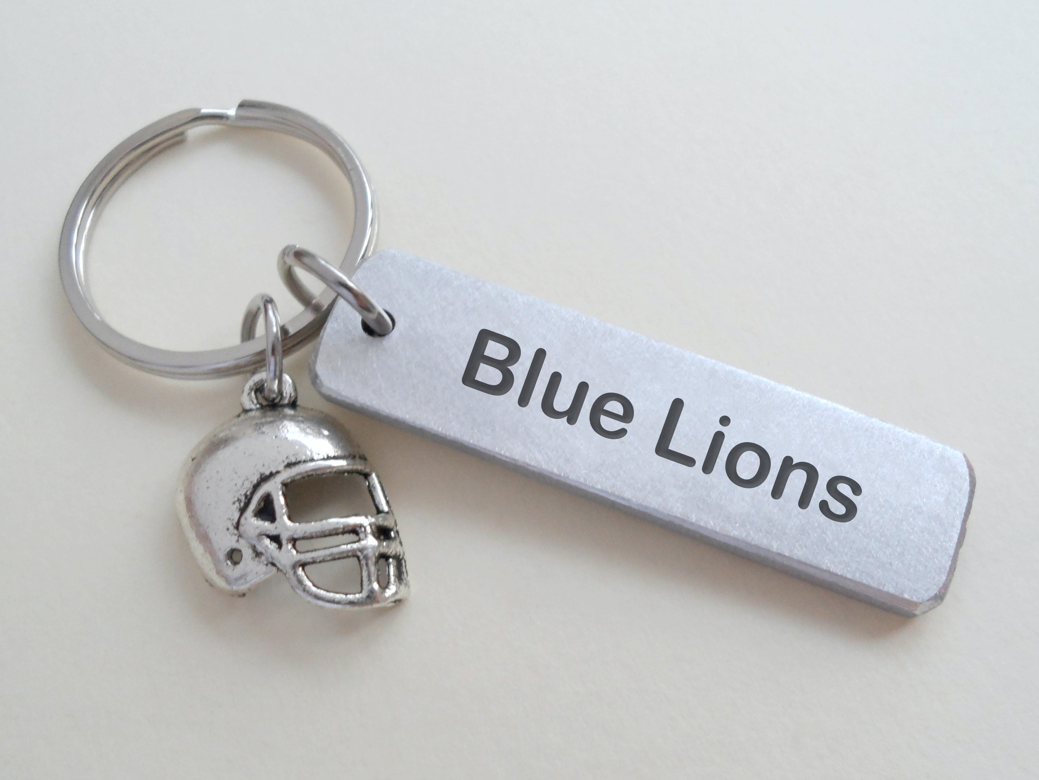 - A keychain with football helmet charm and a custom engraved aluminum tag.
