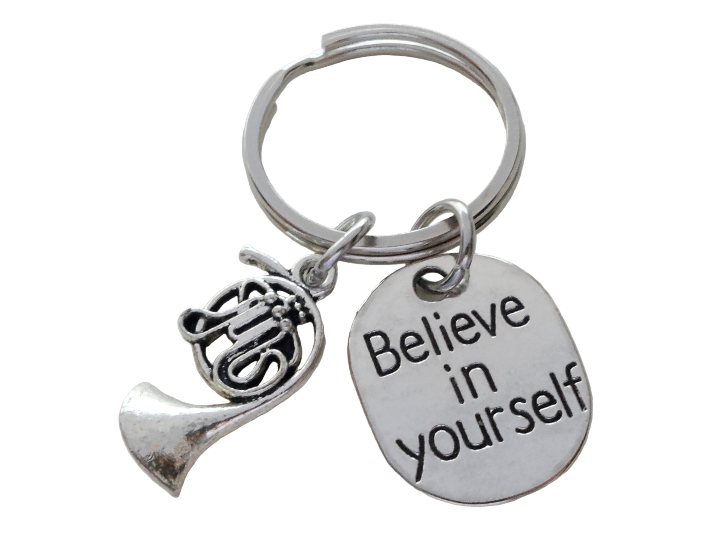 - This keychain comes with a French horn charm and a "Believe in Yourself" charm.