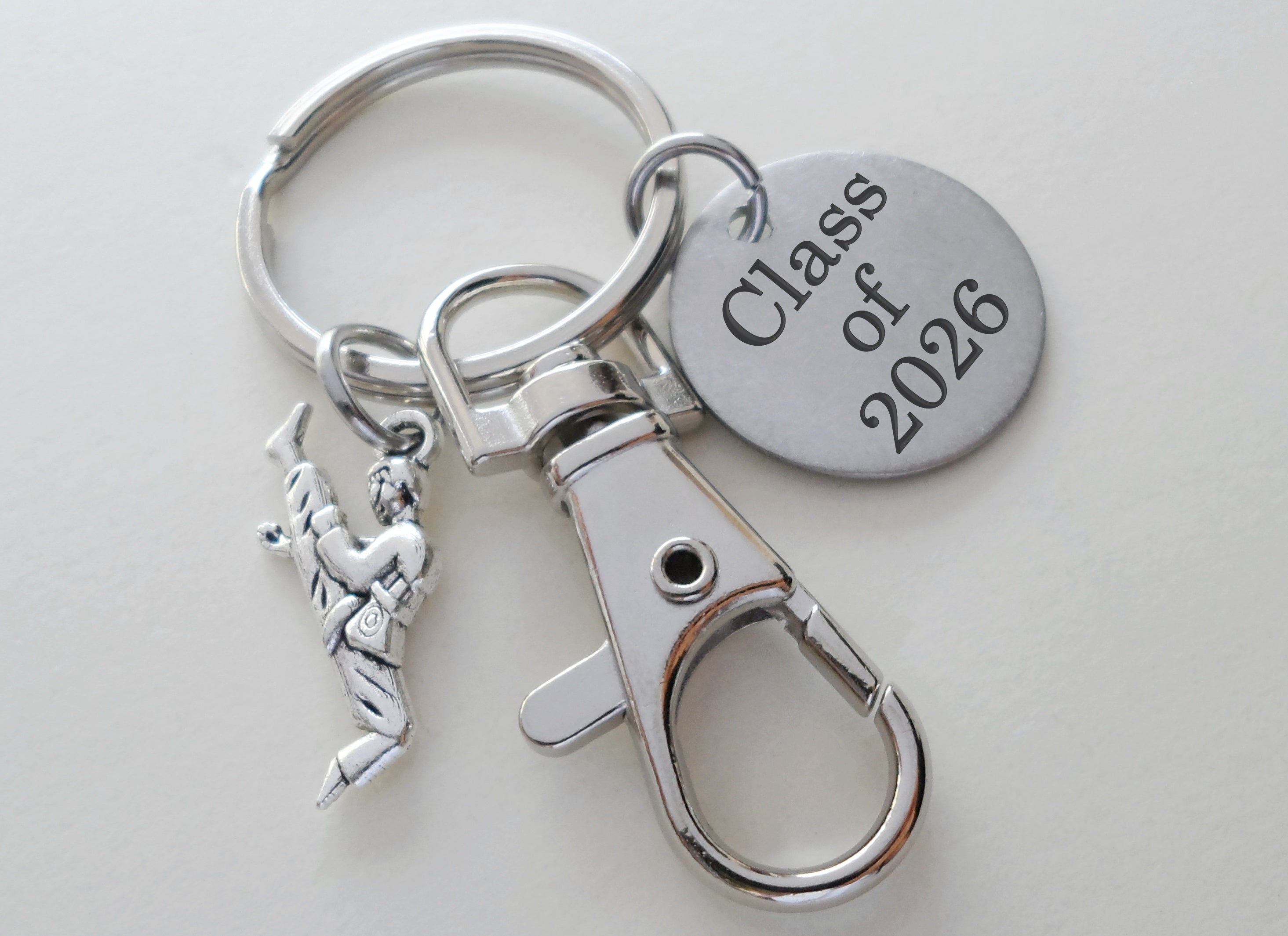 Martial Arts Keychain with Kicking Student Charm, Swivel Clasp, and Custom Engraved Disc; Karate, Taekwondo or Coach Keychain