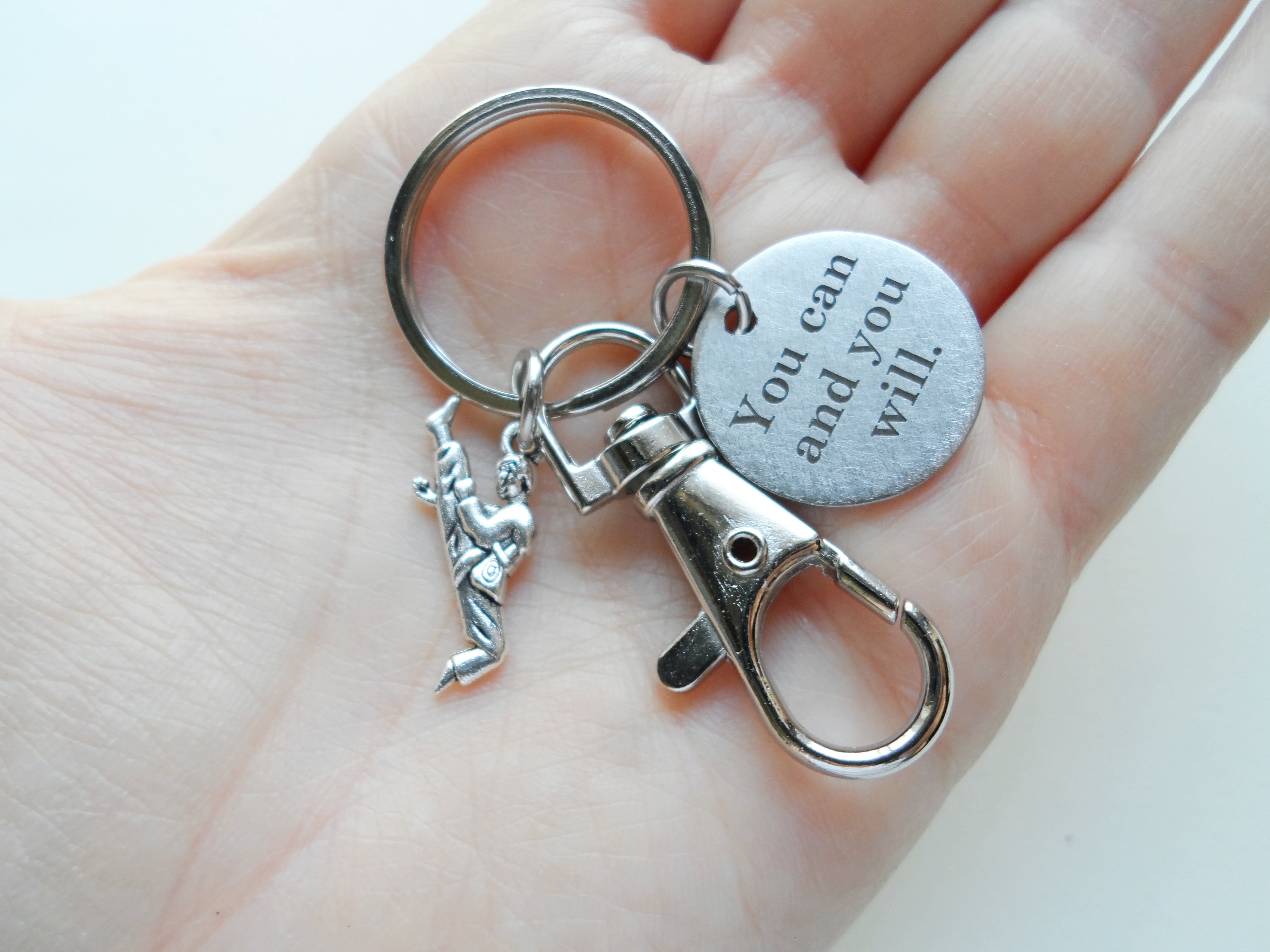• One keychain with a kicking martial arts student charm, a swivel clasp, and a custom engraved disc.