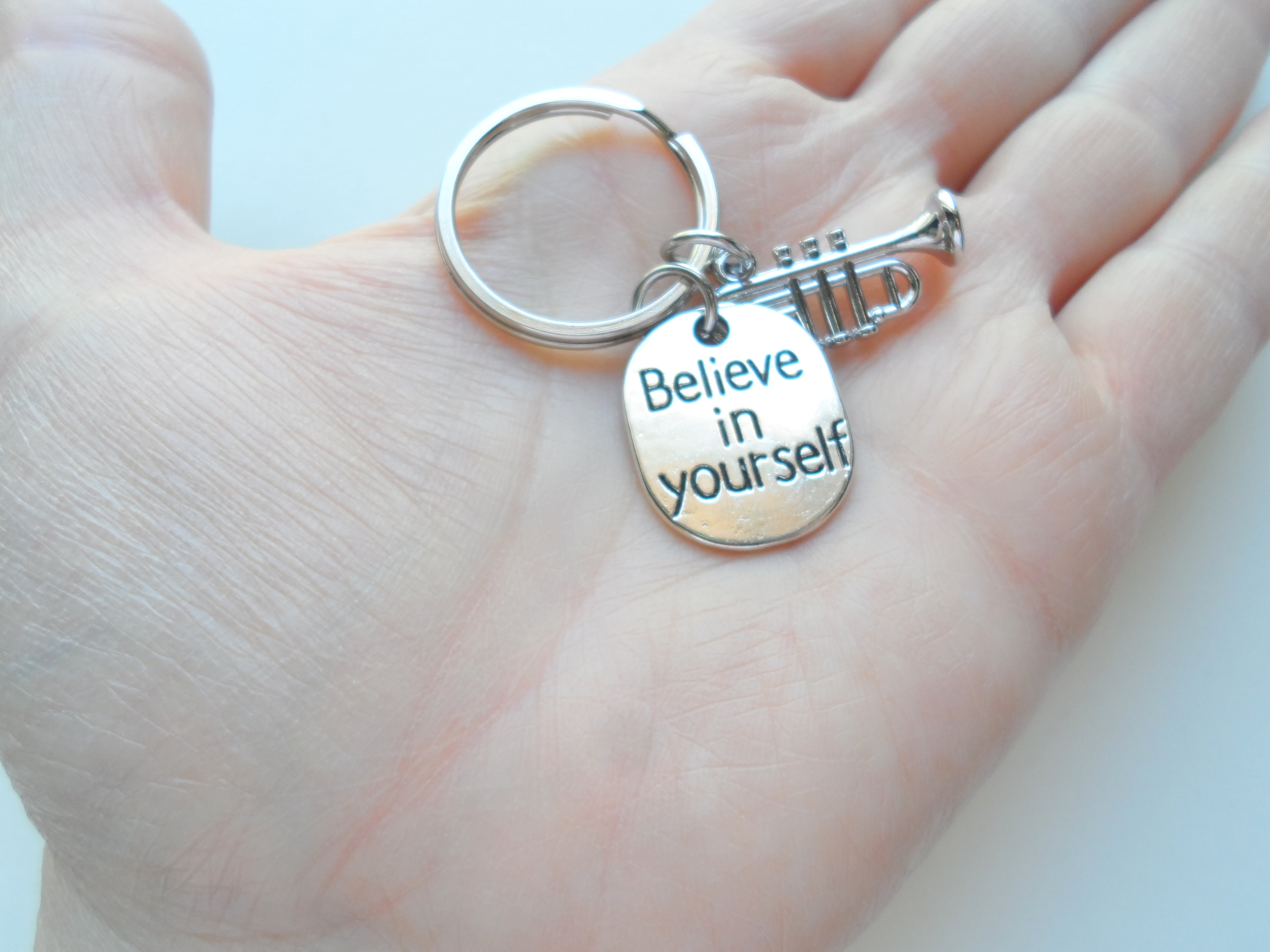 • This keychain comes with a trumpet charm and a "Believe in Yourself" charm.